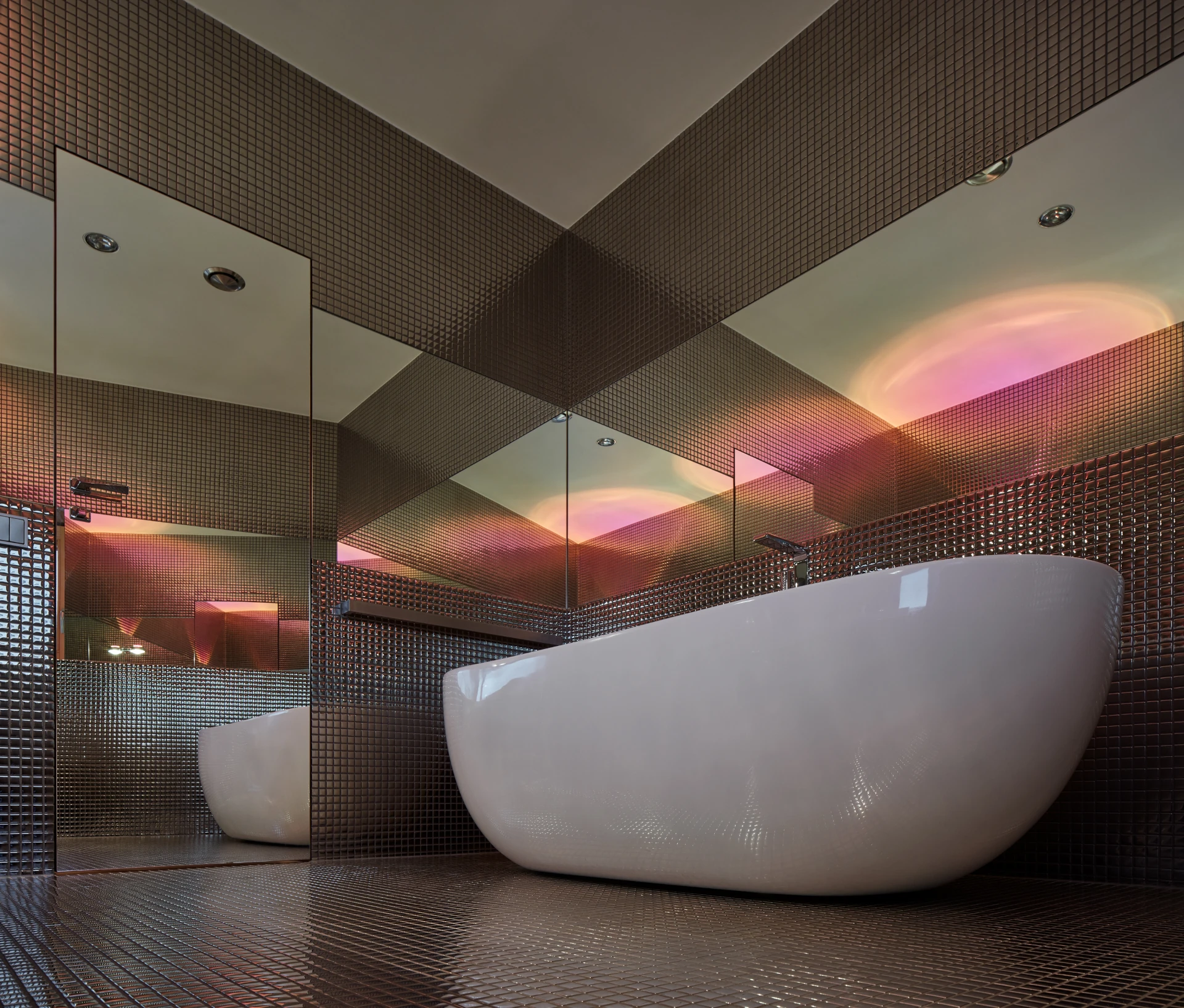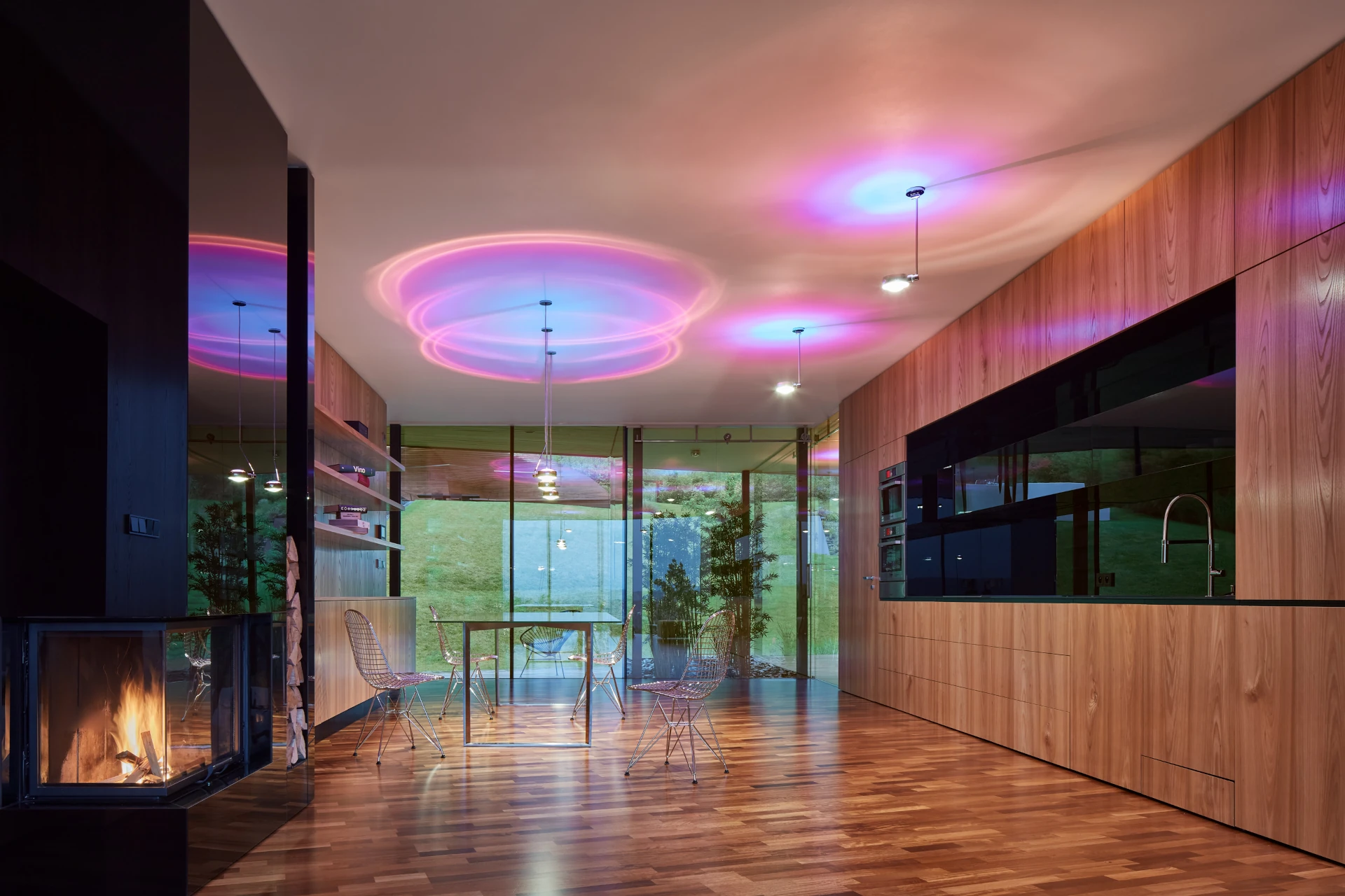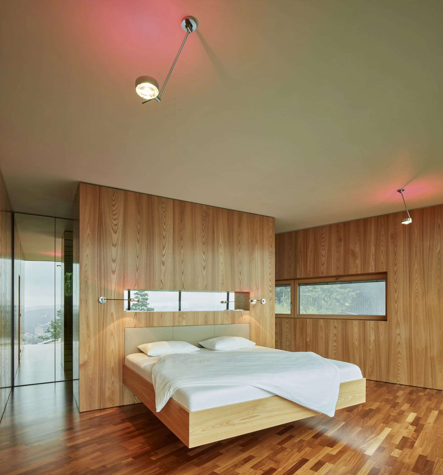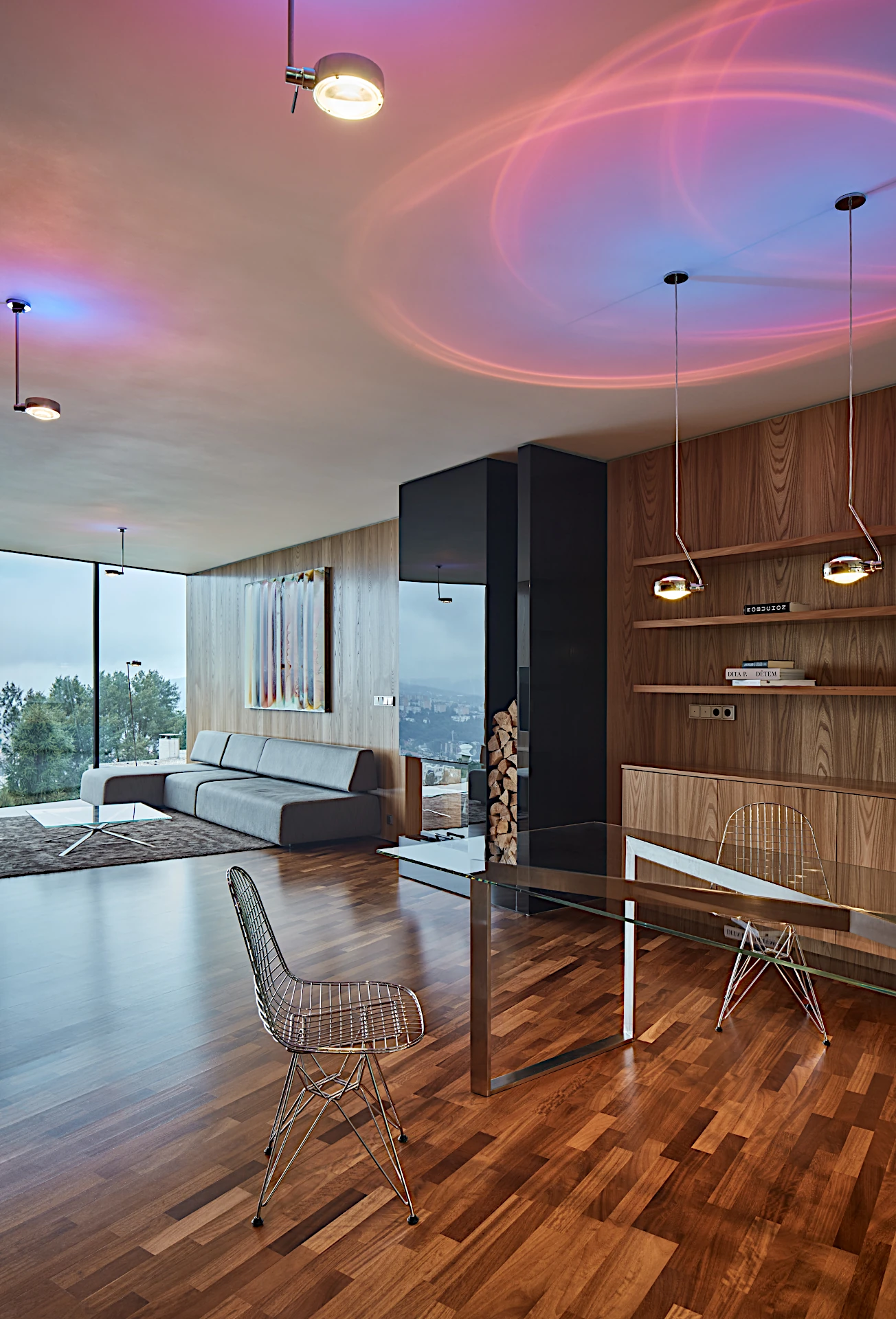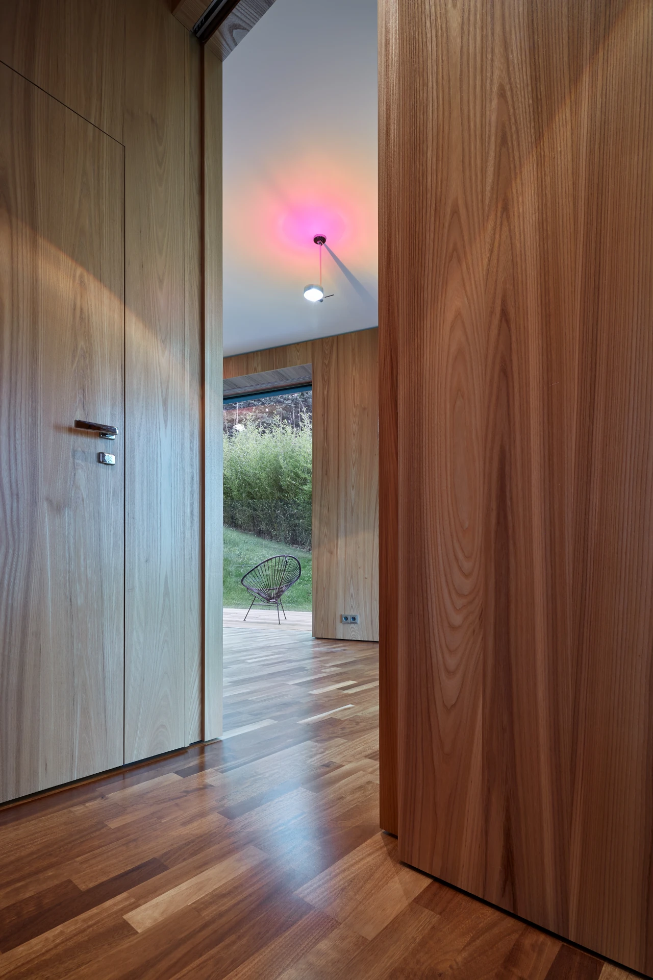 The main living space is located on the upper floor: living, kitchen and dining areas are laid out as an open plan, with private rooms at the corners of the floor space, offering either garden or city views. Iridescent lighting, diffused by two-colour filters, bathes the interiors in a pearlescent glow. Walls, floors and cabinetry featuring wood of different patterns and textures are paired with stylish furniture pieces to mimic the contemporary aesthetic of its exterior.