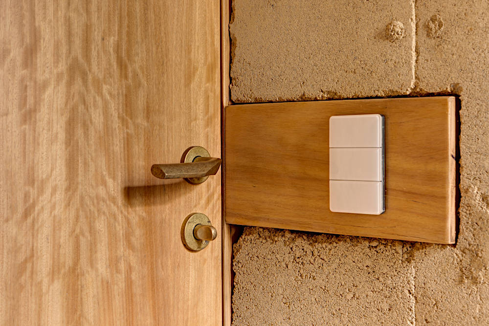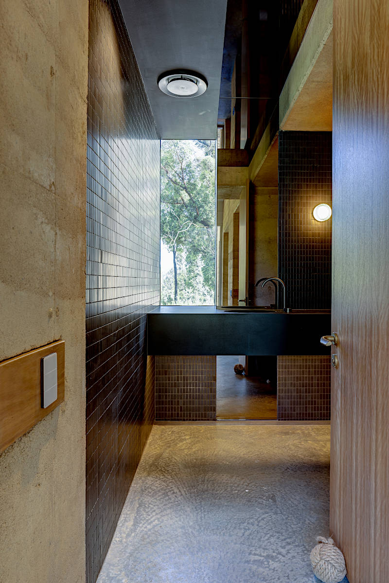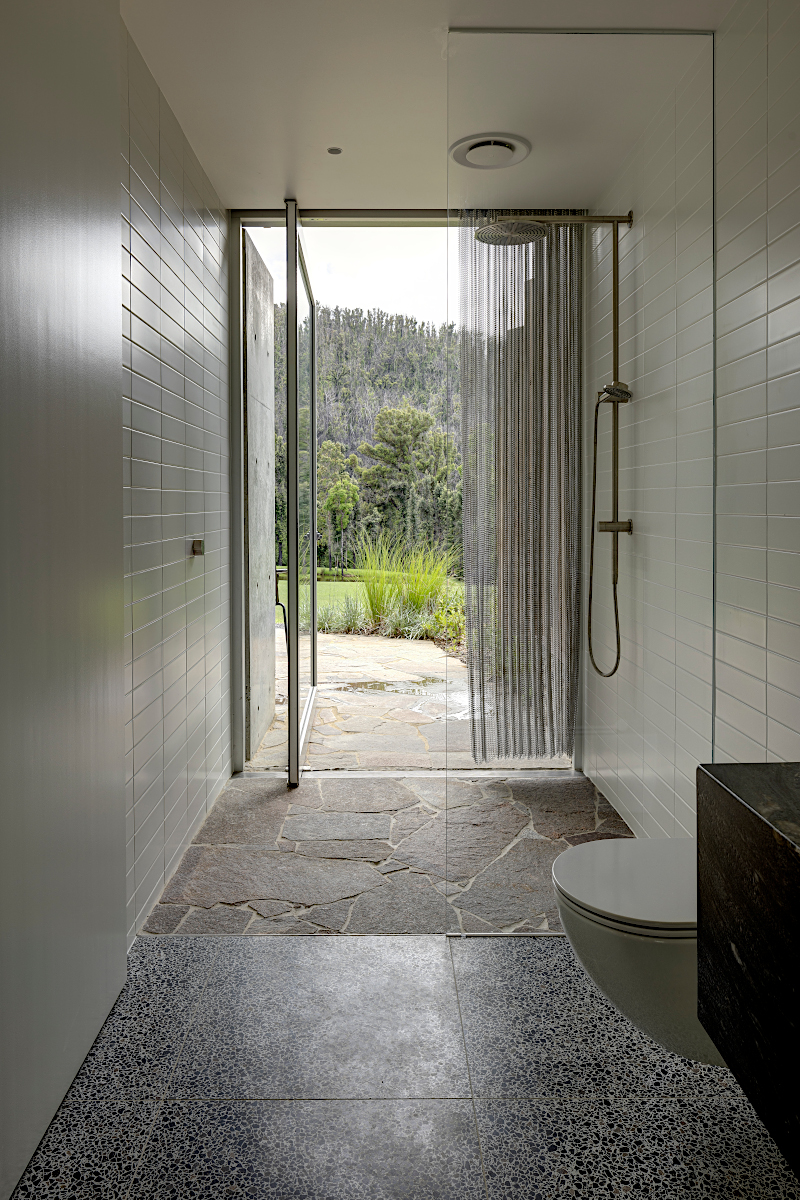 This enriches the sensual experience of drawing aside a mesh shower curtain, the sound of rain on the roof, the hand-feel of a beautifully crafted door handle, the smell of timber, and the cool glow of concrete.