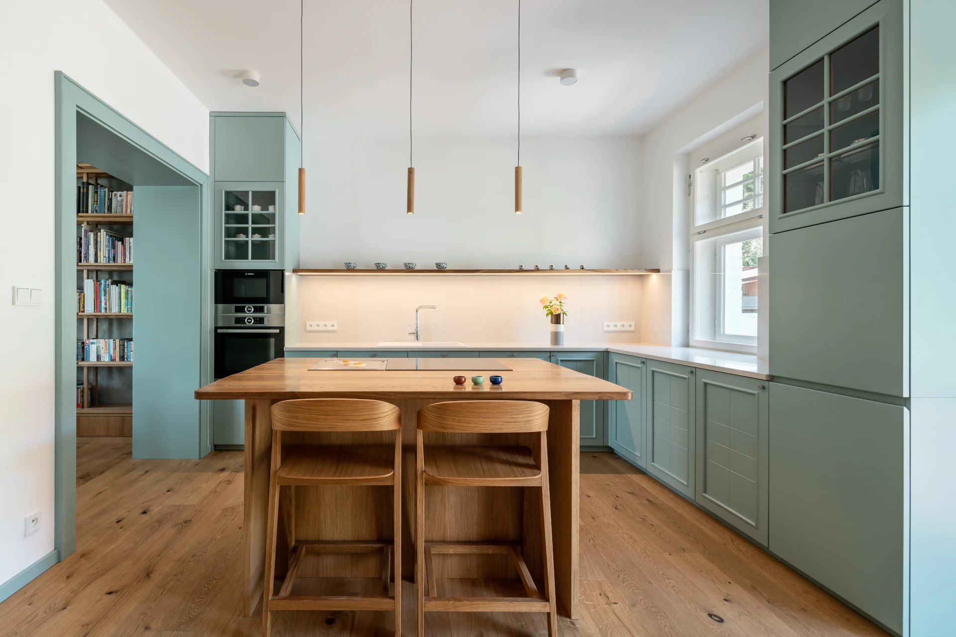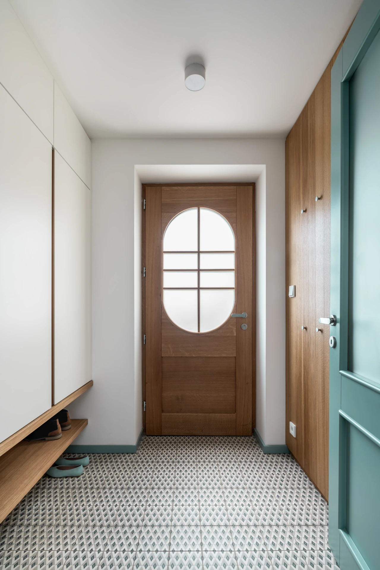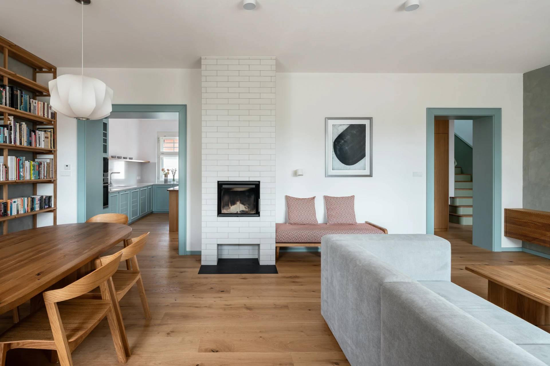 Entering the house, one finds oneself in the atmosphere of the last century, leaving no one in doubt that a rich history has passed here, lined with the stories of its inhabitants. Primarily due to the original surviving tiled floor with its tiny pattern. Thick walls are adorned with large portal frames in turquoise throughout the house. Warm woods complement the icy shades of color throughout the space. The doors and door frames remain turquoise, and most of the walls bear white, except for the one behind the television and library, which transitions into a gray squeegee. It's an element that breaks up the uniformity of the walls and makes the space pleasantly lively.