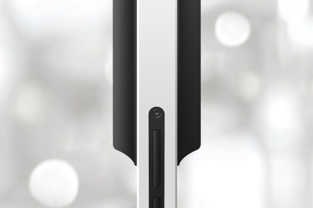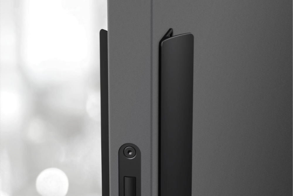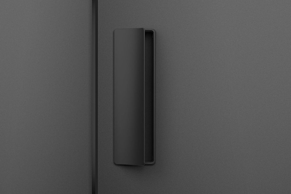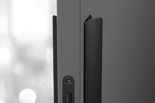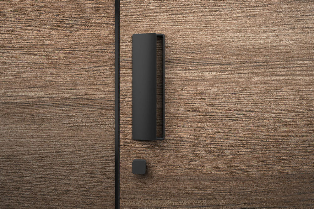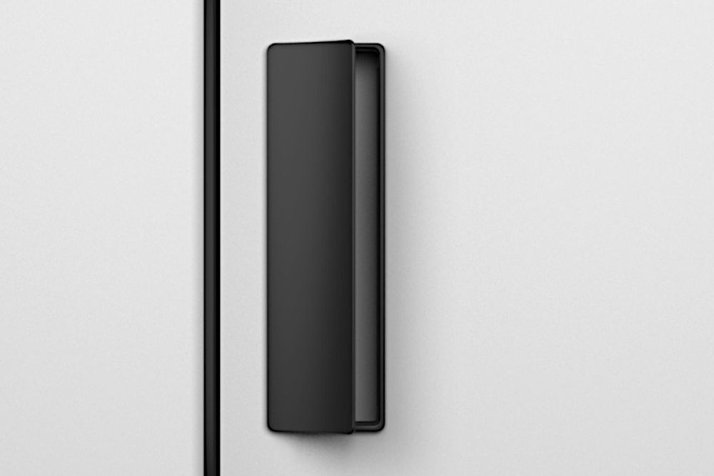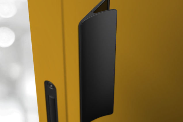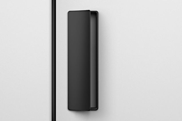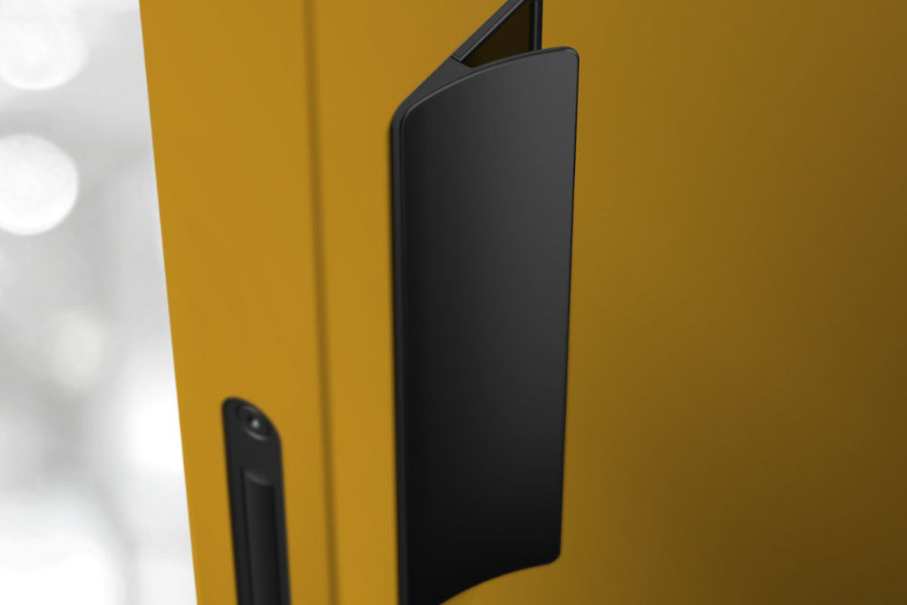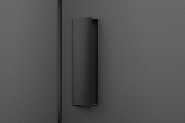 Dominant pull handle with whole hand control. Handle ergonomics with slight rounding of the handles gripping part, with the possibility of changing/replacing the internal magnetic plate to align the surface/color of the pull handle with the door, or to make the door control area more visible.