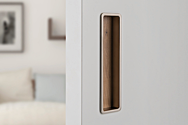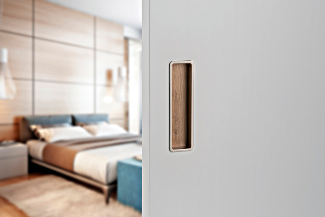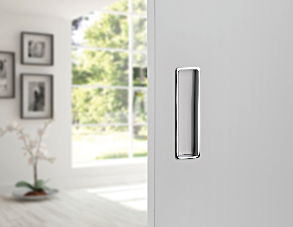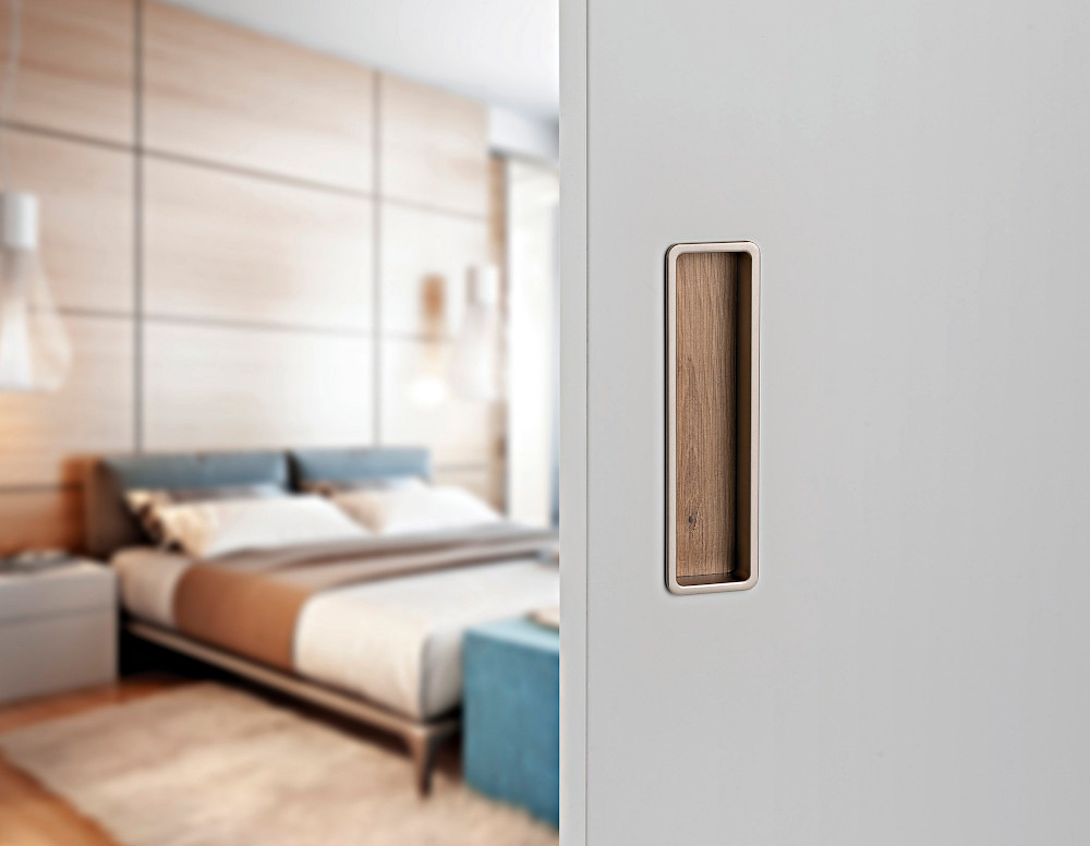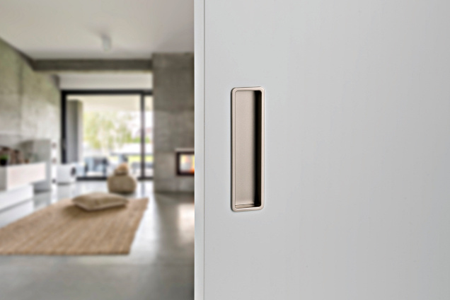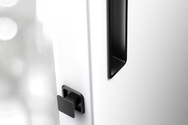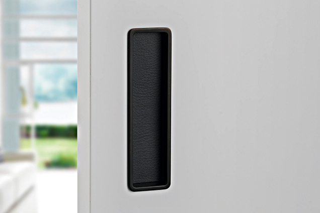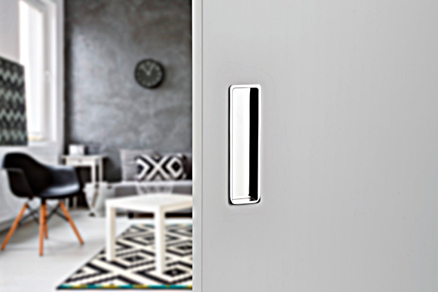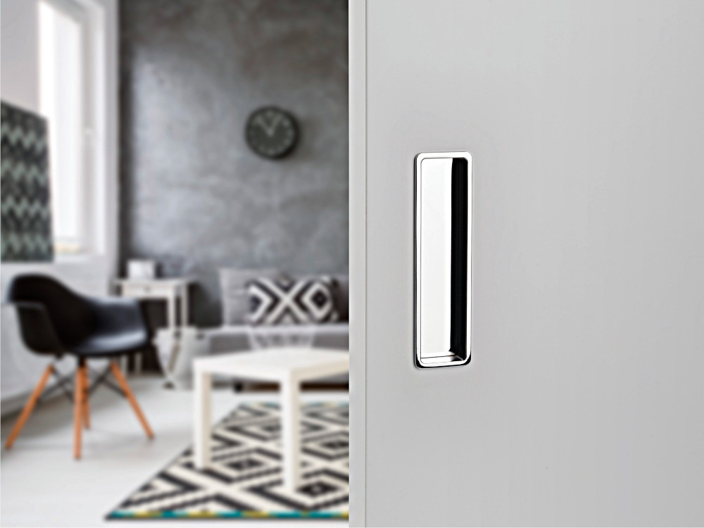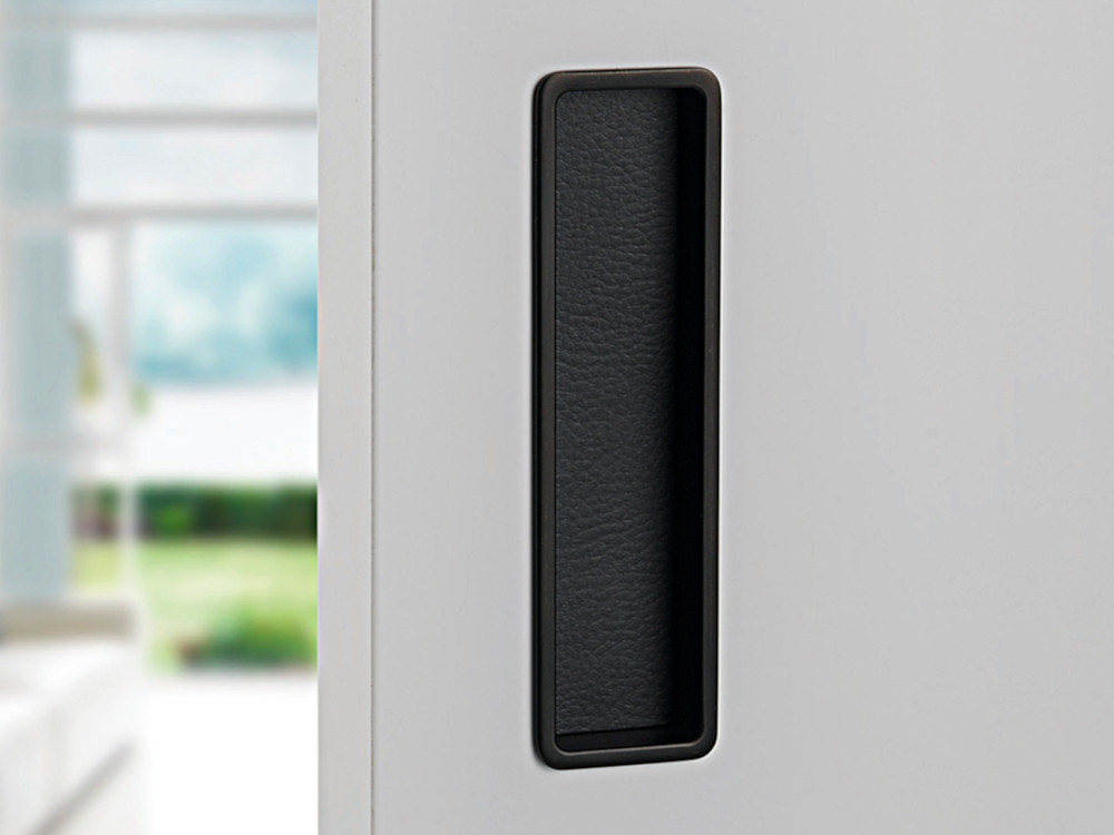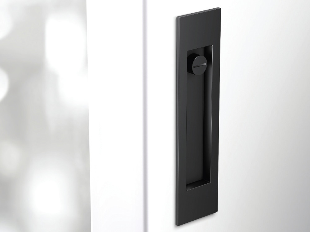 For the locking version, a set with a mortise lock in the color of the lock face similar to the color of the pull handle, a counter plate and a cover tray.